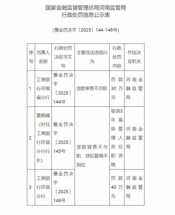 11月6日,国家金融监督管理总局河南监管局行政处罚信息公示表(豫金笔决字[2025]号),中国工商银行许昌分行因在贷款调查和贷后管理方面未尽职尽责,被罚款40万元,雷晓峰(时任中国工商银行许昌分行行长)被取消担任高级管理人员资格。三年。