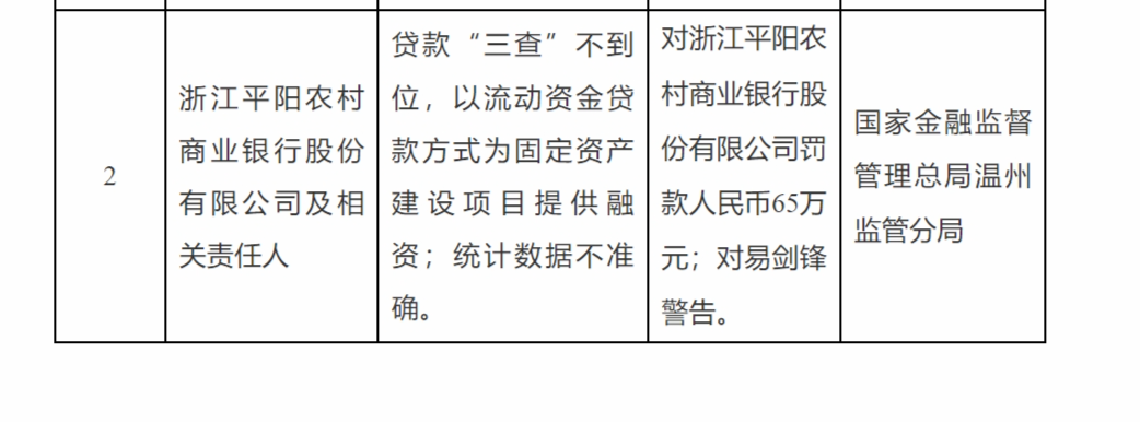 11月6日,国家金融监督管理总局温州监管局行政处罚信息公示表显示,浙江平阳农村商业银行股份有限公司未完成贷款“三检”,以流动资金形式为固定资产建设项目提供融资;统计数据不准确,罚款65万元;相关责任人易建峰受到警告。